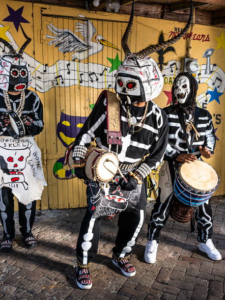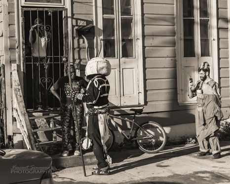 Haitian, African, and Carribean Incluences are channeled through the entities who roam the streets 5am sharp on Mardi Gras Day. An ominous reminder of the thin threshold between life and death. No one can escape the debts they have to pay.